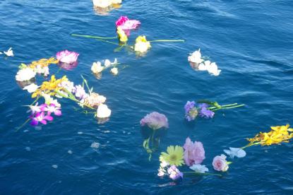 1日午後2時半すぎ、7人を乗せたチャ−タ−船が石垣島最大の名蔵(なぐら)港を出港した。汗ばむほどの快晴。太陽の照り返しがキラキラと反射する。ほぼ、凪(な)ぎ。約20分後、湾外の散骨の現場へ。水溶性の白い袋に詰められたパウダ―状の粉骨があっという間に海水と溶け合い、その部分が白濁色に変わった。波間に揺れる亡骸が一瞬、小型のマンタのような、あるいはジュゴンのような輪郭を刻んだように見えた。その周辺を折り鶴たちが浮き沈みした。妻が亡くなる直前まで聴いていたバロック音楽のCDがセットされ、船内にはパッヘルベル(ドイツの作曲家)のカノンの世界が静かに広がった。