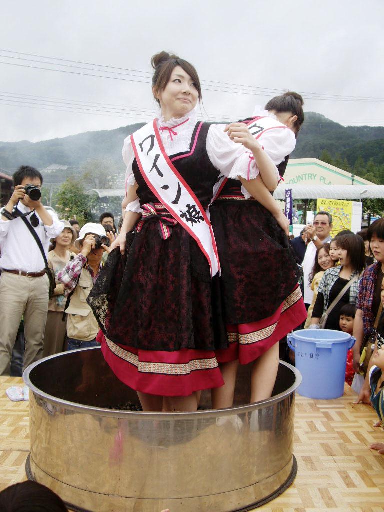 ▼「大迫ワインまつり」ワイン娘のぶどう踏み!