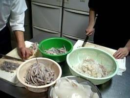 お刺身でも食べられるほど新鮮なイカの胴から、頭や脚を内臓ごと抜き取り、内臓と脚を切り分けます。内臓はたっぷりの塩で塩漬に。胴はエンベラを外して皮を剥いて中身をそうじ。頭からは目玉や硬い口の部分を取り除き、皮を剥いて脚を一本一本に切り分ける。脚からは吸盤をきれいに取り除き、エンベラ、胴、脚をきりこみサイズに切って、これも塩漬けに。あとは翌日の朝に塩漬にした内臓と身を合わせ、酒と味醂を加えて塩で味を整えて、やっと美味しいきりこみが出来上がります♪