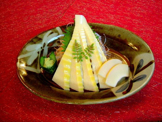 大鍋に水をたっぷり、筍の先を斜めにカットし、後でむき易いように切れ込みを入れます。鷹の爪と米ぬかを入れるのは、独特のエグ味を失くすため☆筍の大きさにもよりますが、落とし蓋をして約2〜3時間、鍋一杯に入ったお湯が溢れてしまわないように火加減を見ながら火にかけます。あとは火を消してそのまま一晩置いておけば、次の日には美味しい筍の出来上がりです♪皮を剥いて先の硬い部分は切り落とし、胴回りの黒いブツブツ(?)をそぎ落として、食べやすい大きさに切って盛り付けます☆刺身で食べても美味しいし、ダシもよく出るので「若竹そば」や「若竹煮」、お吸い物や炊き込みご飯などにしてもいいですね♪