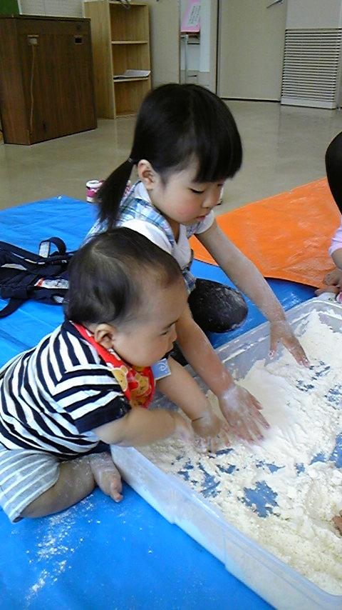 前回の片栗粉あそびに続き今日は小麦粉あそびでした〜。