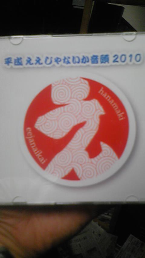 先週FMで流したところ、花巻のいたるところで地味に話題となっているのが、私が作詞・作曲した「平成ええじゃないか音頭2010」。夏に大盆踊り大会をするつもりが、大雨で中止。残念無念の想いを抱きつつ、「花巻ええじゃない会」プロデュースの自主制作CD−ROM、花巻市上町チャレンジショップ「はなまるくん」で500円で販売中(写真)。本当に大変な世の中であるが、この歌聴いて、とりあえずはええじゃないか〜!! で地元から火をつけていきましょう!!