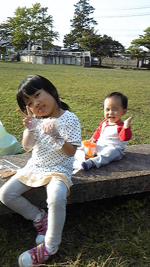 おやつ大好きな二人、天気も良くて気持ち良く、お外でいつもより美味しそうに食べてました〜。