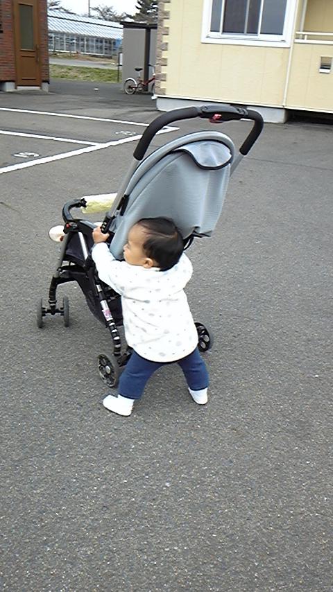 今日は外で自分が乗るはずのベビーカーを押して歩きました。