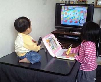 テレビゲームでカタカナの勉強をして遊ぶカエデを見るソラ(^_^)