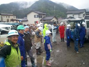 自分たち2名と北上から来ているボランティの方々と約20名程度での作業でしたが今回の大部分の作業が敷地内のヘドロ出しということで臭いもきつく、しゃがんでやる作業でしたので慣れない作業に負けずメンバーが汗びっしょりかきながらも頑張ってました。