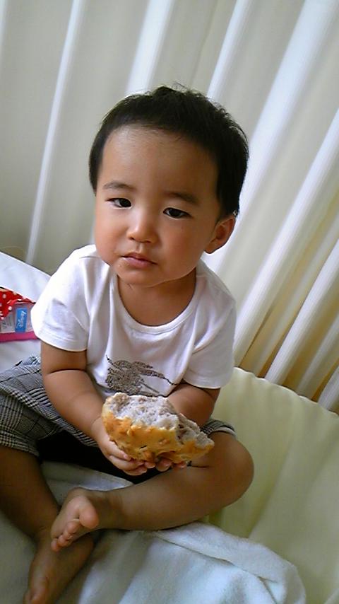 ベットの上でパンやいただいたパイをパクパク食べて、ピョンピョン跳びはね、部屋をウロウロして、母との一時を楽しんで、
