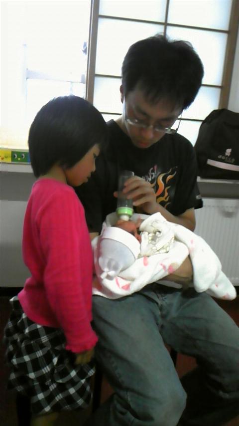ミルクを飲ませるお父ちゃん。