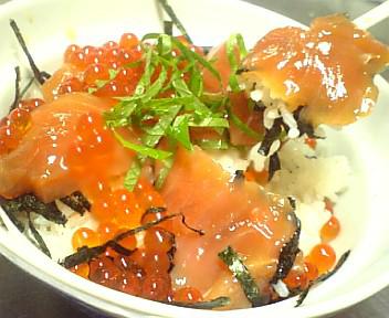 鮭とイクラの紅葉漬け(こうようづけ)に、紅葉に色づく山をイメージして大葉を添えて丼にしましたo(^-^)o