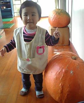 カエデを幼稚園に送りに行って、玄関のでっかいカボチャとパチリ☆