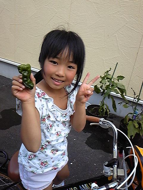 プランターで育てているピーマン、一時期虫にやられてダメかと諦めていましたが、今日無事に一つ収穫できました☆