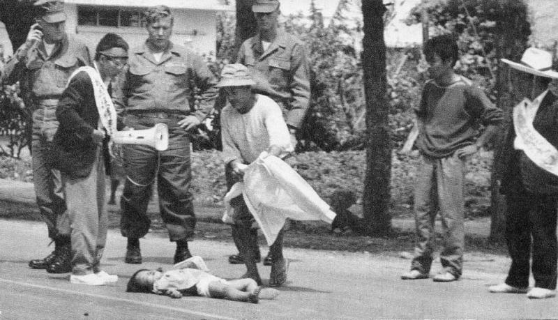 祖国復帰行進のさ中の出来事だった。行進団の一人が米兵たちの気をそらせている間に、右手前の白シャツの人の肩越しに夢中でシャッタ―を切った。嬉野さんが撮影した決定的な瞬間は沖縄における米軍基地の実態を暴露する形になった。しかし、現在に至るまで「本土(ヤマト)」の側は「無知・無関心」を決め込んでいる。