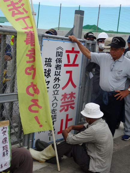 老いを背負った一人の男性が不動の形で土砂搬入に抗議を続けていた=名護市安和の琉球セメント桟橋入り口で
