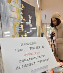 米軍占領下の沖縄でもがきながら生きる若者たちの姿を描き、直木賞を受賞した真藤順丈さん(41)の小説「宝島」(講談社)が沖縄県内で反響を呼んでいる。受賞発表翌日の17日、各書店では売り切れが続出。那覇市内の書店スタッフは「直木賞受賞作と言っても、これだけ反響があるのはめったにない。異例だ」と驚き、「沖縄の歴史や今も続く基地問題について考える一冊」と称賛する。 物語は、米軍基地から物資を盗む「戦果アギヤ−」と呼ばれた若者たちを描く。沖縄の言葉をふんだんに盛り込み、沖縄の戦後史に切り込んだ意欲作だ。那覇市久茂地のリブロリウボウブックセンタ−店では、直木賞が発表された16日夜、閉店間際に本を求めて数人が駆け込んだ。17日も朝から売れ続け、用意した40冊は午後3時ごろに完売した。 ライタ−の友寄貞丸さん(58)=那覇市=は、知人から東京で売り切れているので手に入れてほしいと連絡があり急いで購入。「沖縄の戦後史を本土の作家がどう捉えて小説にしたのか興味がある」と笑みを浮かべた。店頭に並ぶ最後の2冊を購入したのは那覇市の60代の夫婦。「小説の舞台が沖縄なので読みたくなった。復帰前の私たちは高校生。主人公の思いが重なるかもしれない」と話した。 同店スタッフの宮里ゆり子さん(37)は「表現力がすごくて、読んでいると頭に映像が浮かんでくる」と絶賛した。「主人公が今の沖縄で生きているなら、基地にどう向き合っていただろうかと考える。基地がある沖縄の歴史や今も続く問題を考える一冊だと思う」。16日夜にブ−スを設けた同市牧志のジュンク堂那覇店では、17日正午すぎに50冊が完売。200冊を追加発注した。森本浩平店長(44)は「圧倒的なクオリティ−。きょうは年配の方が多く購入していたが、若い人たちにも手にとってほしい本」と太鼓判を押した。 午前中で22冊が売り切れた同市おもろまちの球陽堂書房メインプレイス店では、すでに20冊以上の予約を受け付けた。新里哲彦店長(61)は「小学校への戦闘機墜落、交通死亡事故の無罪判決、コザ騒動など、主人公を通して沖縄の痛みが理解できる。多くの人に読んでほしい」と願った。 【ことば】戦果アギヤ− 戦後の沖縄で、米軍の倉庫から豊富な物資を盗み出すことを得意とした人のこと。食うや食わずの住民生活に比べて米軍物資はあり余るほど豊かで、生きていくためのぎりぎりの手段でもあった(1月18日付「沖縄タイムス」) (写真は売り切れの張り紙を出した書店=1月17日午後、那覇市内のジュンク堂書店那覇店で、「沖縄タイムス」より) 《追記》〜ある予感 「沖縄の米軍基地から物資を盗み出す“戦果アギャ−”は年端もいかない少年少女たち。『生還こそがいちばんの戦果』と言っていたリ−ダ−がある夜突然消えた。圧倒的熱量!!聴け、沖縄の歌を」(1月19日付「朝日新聞」)―。第160回直木賞と第9回山田風太郎賞の2冠を達成した真藤順丈さんの『宝島』を宣伝する新聞広告にある予感を感じた。「沖縄」問題に“知らぬが仏”を決め込んできた本土(ヤマト)側に、この本はなにか別の風を吹かせるのではないか―そんな予感を。その一方で「逆もまた真なり」という不吉な予感も…