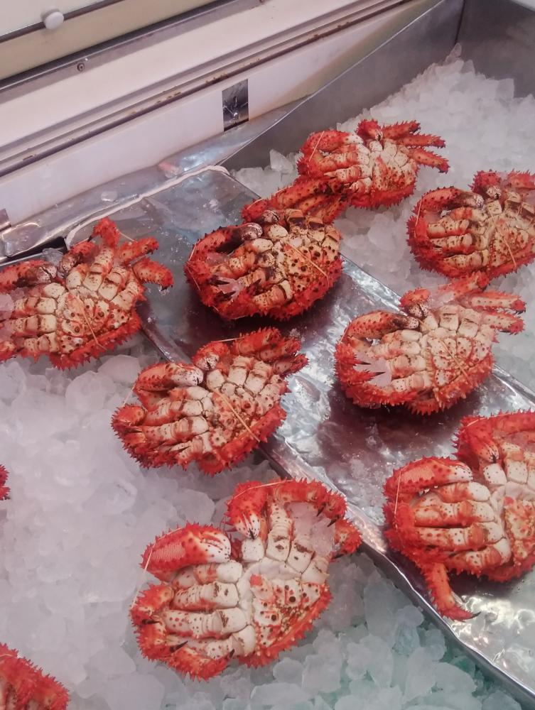 かつての密漁の王者「花咲ガニ」。カニとはいうが、実際はヤドカリの仲間=5月18日、根室駅前の土産物店で