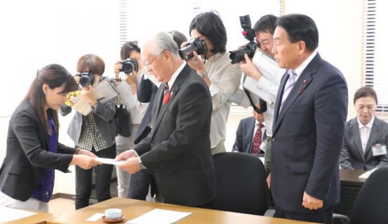 長崎市議会の佐藤議長に申し入れ書を渡す新聞労連の関係者=11月1日、長崎市役所で。インタ−ネット上に公開の写真から)