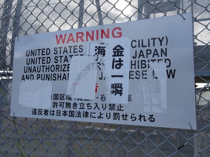 フェンスのあちこちに「立ち入り禁止」の標識が…=同日午後、キャンプ・シュワブで