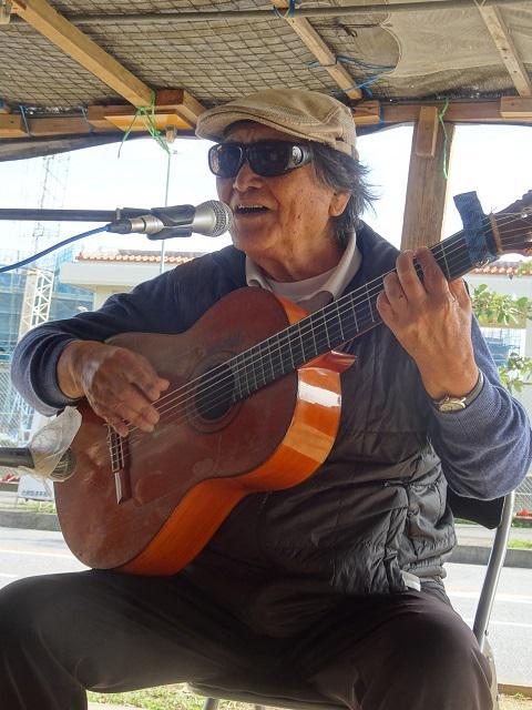 代表作の「喜瀬武原」を熱唱する海勢頭さん=同日午後2時すぎ、キャンプ・ハンセン向かいの反対派拠点テントで
