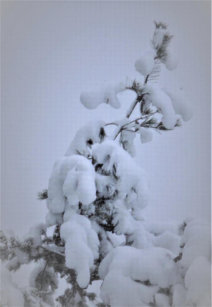 自室から降り積む雪をぼんやりと眺めていると、今度は”雪っ子”たちがまるで息絶えたかのように木にしがみついているようにに見えるではないか。「造化(ぞうか)の妙」ともいえるが、あの恐ろし気な芝居『雪之丞変化』を想起させる光景でもある=12月16日午前11時すぎ、花巻市石鳥谷町の仕事部屋の自室から)