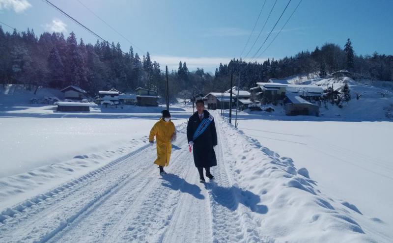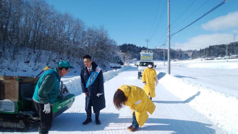 8:30〜「センセイ、センセイ」と呼ぶ声。障がい者施設の園長時代、入所者のひとりだった「まきちゃん」。お母さんも顔を出し、がっちり握手。「障がいのある方が笑顔いっぱいのまちをつくります」とまさみちさん 9:25〜昨日とは打って変わっての晴天。しかし、この日中でも気温は零下12度。地元の東和町に近づくにつれ、熱気が伝わってきた。沿道を埋めた住民はざっと、50人。白雪に照らされて、みんなの目もキラキラと輝いている。まさみちさんも気合十分。さぁ、行け「まさみち号」 10:14:〜田瀬地区で街宣。「ここで初めて口にしますが、父は寝ても覚めても田瀬ダムの行く末を気にしていました」とまさみちさん。十数人の住民は“父親秘話”に身を乗り出して、聞き入った 10:25〜まるで、墨絵のような雪景色、雪布団をかぶった棚田もまた、格別。「昔、このあたりには“隠し田”がたくさんあった。年貢を免れるための百姓の知恵。山からの水も豊富だったから」―車中のこんな会話も楽しみのひとつ 11:02〜下浮田地区の田園地帯。雪原のてっぺんで、頬かぶりしたおばあちゃんが雪かきの手を休めて両手でバンザイ。辛口評定で知られる運転手さんが自信たっぷりに言った。「いまの瞬間で決まった。(投開票日の)23日はハッピ−デ−になる」 11:16〜走る、走る。まさみちさんと支持者とが“脱兎”のごとく走る。長い耳同士の二兎ががっちりとグ−タッチ。さぁ、ゴ−ルはもう、目の前 11:37〜大リーグの菊池雄星投手の伯父さんが除雪機の運転を止めて、待ち構えていた。「いやぁ、こっちこそ、雄星さんから勇気をと元気をもらったんです」とまさみちさん。行政区長を務めるおじさんはただただ、ニコニコ笑っているだけ 11:54〜高台で雪かきシャベルをグルグル回しての応援メッセ−ジ。四囲から「まさみち」コールが聞こえてくるな、そんな気分に… 12:46〜「おめさんが38歳で議員になった時から、ずっと見てきた。市長に出ると言った時は正直、びっくりした。んだども、おめさんの偉ぶらないところが、オラは好きだ」―。支援者のこの言葉に今度はウグイスさんが感激、マイクの声が涙声に… 14:41〜スーパーなど大型店舗が立ち並ぶ高台からの大音声。眼下には買い物客の車がずらり。響け、広がれ、どこまでも!寒風に向かって、みんなで叫ぶ 15:13〜花南地区を遊説中、沿道のあちこちからグ−タッチを求める手招きが…。この作法はコロナ禍がもたらした数少ない恩恵なのかもしれない。一目散に駆け寄るまさみちさんを見ながら、「選挙とは実に健康増進のための運動なのだな」と別のことを考えていた 15:46〜富士大の真ん前。女子学生ふたりが構内から出てきたが、ちらっと眺めながら、通り過ぎた。無関心のなせるわざかとがっかりしたが、「皆さんの大学との連携を強めたい」とまさみちさんが口にしたとたん、あちこちの窓から手を振る姿が。ホッとして、「必ず、投票に行ってくれよ」と思わず、叫んでしまった 16:16〜賢治教育に力を入れている南城小学校の下校隊列に遭遇。きちんと挨拶をして、「ガンバって」の大合唱。さすが… (写真はウグイスさんと雪道を走るまさみちさん。昨日、スッテンコロリンしたので、この日は滑り止めのついた長靴に=12月19日午前、東和町内で) 《追記》〜「いやぁ、勇気と元気をもらったのは、こっちの方で方です」(コメント欄に写真) 大リーガ−、菊池雄星投手の伯父さんと親しげに言葉を交わすまさみちさん。左が行政区長を務める伯父の佐々木雄幸さん(84)=1月19日午前、東和町内で