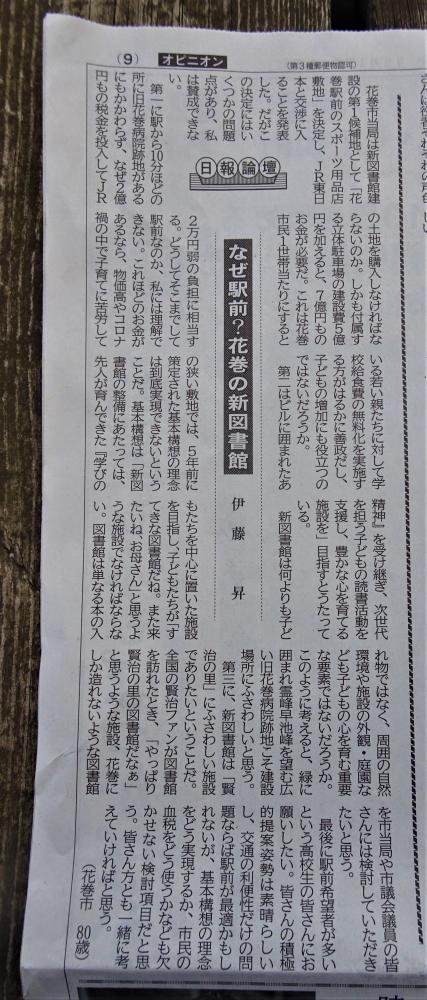 JR花巻駅前か旧花巻病院跡地か―。新花巻図書館の立地場所をめぐる市側の態度表明に注目が集まる中、私は後者への立地を望む立場から、その理由を記した一文を岩手日報の「日報論壇」へ投稿した。掲載はまだ先になりそうだが、記者会見(24日)や花巻市立図書館協議会(25日)などこの問題を避けては通ることができない重要会議が迫っており、前倒しして当ブログに掲載することにした。また、同趣旨の寄稿文が同じ「日報論壇」に載っているので、参考までにコメント欄に添付する。 ※ 目の前にこつ然と現れた広大な“空間”に身を置きながら、「図書館の立地はここしかないな」と直感した。花巻市は10月11日から27日まで市内17か所で新図書館の建設場所をめぐって、意見集約のための市民説明会を開催した。その第1候補に挙げられているのがJR花巻駅前のスポ−ツ店用地で、当局側はその取得に前向きな姿勢を見せている。 こんな折しもかつて、花巻城跡に隣接した旧総合花巻病院の移転・新築に伴って、24棟を数えた病棟が解体された結果、私たちは約100年ぶりに由緒ある遺跡など城跡のおもかげに接するという幸運に恵まれた。晴れた日には高台の城跡から霊峰・早池峰など北上山地の雄大な姿を望むができる。当該地は郷土の詩人で童話作家、宮沢賢治の作品にも数多く登場し、たとえば『四又(よまた)の百合』に出てくる“ハ−ムキャの城”とはすぐに、花巻城跡と察しがつく。 さらに、賢治が学んだ現花巻小学校と自らが教壇に立ち、“桑っこ大学”とも呼ばれた旧稗貫農学校に挟まれたロケ−ションはまさに「文教地区」にふさわしい立地条件と言える。現在「まなび学園」(生涯学習都市会館)として、市民に学びの場を提供している場所もこの地に隣接し、かつては賢治の妹トシが学んだ花巻高等女学校(県立花巻南高校の前身)の建物だった。これもまた、歴史の奇縁かもしれない。 実は「図書館法」(昭和25年4月)の生みの親が当地ゆかりの「山室民子」だということは地元でも余り、知られていない。慈善団体「救世軍」の創設者・山室軍平の妻で、花巻の素封家に生まれた旧姓・佐藤機恵子が民子の母である。民子は図書館法を起案するに当たって、生涯教育の大切さを訴えた。 1世紀という時空間をへて、今よみがえった「百年の記憶」と未来を見すえた「百年の計」と―。解体工事で全貌を現した「濁り堀」について、専門家グル−プは「一級品の貴重な遺構。現状保存が望ましい」と答申した。将来は原形を維持したまま、“歴史公園”として利活用できるのではないか。夢は広がるばかりである。いまこそ、山室民子の“遺訓”を生かすべき時ではないかと思う。花巻小学校とシニアが集う「まなび学園」の間にポッカリと浮かんだ空間。まさに、天啓(てんけい)とでも呼びたくなる、“生涯学習”の場にふさわしい環境ではないか。「天啓」とは「天(神)の啓示」を意味する言葉である。「魂の癒しの場」―。世界最古の図書館といわれるアレキサンドリア図書館(エジプト)のドアにはこう記されているという。 (写真は花巻城址の古地図。約100年ぶりに姿を現した堀跡(濁り堀)の西側に位置する広大な敷地が病院跡地=インターネット上に公開の写真から) 《追記》〜なぜ駅前?花巻の新図書館(コメント欄) 11月17日付の岩手日報「日報論壇」に花巻市在住の伊藤昇さん(80)の寄稿文が掲載された。「図書館とはなにか」という洞察に満ちた内容に感動した。合わせて、お読みいただきたい。