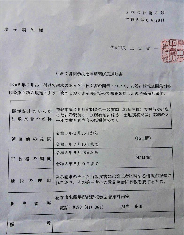 「市長は積極的に花巻市のトップセ−ルスを行います」「市長と市議会は市の両輪です」「市民に情報を提供し、市民の意見を聞きます」「市職員の能力を最大限に活かします」―。9年前の2014(平成26)年2月、現上田東一市長が「花巻に新しい風を!」をスロ−ガンを掲げて初当選した際の「4つの基本姿勢」である。3期目を迎えたいま、“新しい風”どころか、宮沢賢治の理想郷・イ−ハト−ブを破壊しつくす暴風雨だったことが白日の下にさらされつつある。 手元に2通の「開示決定等期間延長通知書」なる文書がある。1通目は花巻市議会6月定例会の一般質問の中で明らかになった新花巻図書館にかかるJR花巻駅前の土地譲渡交渉に関する内容で、私は6月22日付で(受理は26日付)市情報公開条例に基づいて、関連文書の行政文書開示請求をした。条例上の開示期限によると当初、「(令和5年)6月26日から7月10日までの15日間」になっていたがその後、8月9日まで45日間開示を延長する旨の通知があった。その理由については「第三者に関する情報が記録されており、その第三者への意見照会に日数を要するため」とあった。 この件に関しては6月21日の一般質問の中で「(6月)13日にJR側から交渉に応じる」旨の回答があったことが明らかになった。各定例会の初日には市民へ伝達すべき重要な市政課題について、市長による「行政報告」が行われるのが恒例になっているが、6月定例会初日の16日にその言及はなかった。さらに、28日に開催された定例記者会見の場でもこの件に触れる発言はなかった。一方、一般質問の質疑応答では「当方が要求した対象の土地すべて(3,664平方メ−トル)の交渉に応じるという前向きの回答をいただいた。しかし、詳細について明らかにすることは控えたい」(市川清志・生涯学習部長)と「質問があったので答えた」という奥歯にものが挟まった答弁に終始した。 もう1通はJR側からの「土地譲渡交渉」の応諾文書が届いた前日の6月12日に締結された「東北本線花巻駅自由通路及び橋上駅舎整備事業に係る基本協定書」の開示請求で、これも同じ理由で8月4日まで44日間の延長になった。新図書館と駅橋上化という巨大プロジェクトについては当然市民の関心も高く、その成り行きが注目されていた。「基本協定書」締結の翌日の「土地譲渡交渉」の応諾回答…。このタイミングの良さからも上田市長が否定し続けてきた、”利権”がらみの「ワンセット」疑惑が現実味を帯びてくる。今回の相次ぐ「開示延長」に、一方の市民の間には「議会や市民に何か隠しておきたいことがあるのでは…」とあらぬ疑念が起きている。 「市長と市議会は市の両輪、市民に情報を提供し…」―。あらためて、新しい風を呼び起こすという触れ込みだった「4つの基本姿勢」を声に出して読んでみた。「だまされる方がもっと、悪いんじゃないのか」とだんだん、自虐的な気分になってきた。「平成の(風の)又三郎なんて、持ち上げたのはお前さんじゃなかったっけ」…。こんな言葉が天から降ってきた。突然の脳天パンチに一瞬、気を失いそうになった。その通りだったからである。 ふるさと納税の返礼品の見直しで、上田トップセールスの肝いりだった「イーハトーブ花巻応援寄付金」―、その人気商品…”海外産の原材料を使った熟成肉”(牛タン)の先行きも怪しくなってきた。「一体この物語は、あんまり哀れ過ぎるのだ」。賢治の童話『フランドン農学校の豚』は撲殺(ぼくさつ)・解体される動物の悲しみを描いた作品である。イーハトーブのトップセールスマンにはまず、この物語を熟読玩味してもらいたいものである。そういえば、「職員の能力を最大限に活かす」どころか、その職員に対する”パワハラ”疑惑っていうのもあったなぁ、いまもあるんじゃないのかなぁ。旧新興製作所跡地、旧料亭「まん福」跡地…一方で、”負の遺産”だけがうず高く積み上げられていく。そしていま、旧総合花巻病院跡地の利活用の行方に市民の目がいっせいに注がれている。 「どっどど どどうど どどうど どどう 青いくるみも吹きとばせ すっぱいかりんも吹きとばせ…」―。一日も早く、本物の”風神”…「風の又三郎」(賢治)の来訪を望みたい。昔から「風のまち」と言われてきた当地に「凧あげ唄」というわらべ歌がある。「風どうど吹いて来(こ)/海のすみから風どうど吹いて来/豆けら風どうど吹いて来…」―。こんな歌い出しである。 (写真は開示延長を知らせる通知書) 《追記》〜”絶望市民”を名乗る方から、さっそくコメント 政治スキャンダルに発展しそうな様相かも。まさしく、”ウエダゲート”事件ですな。
