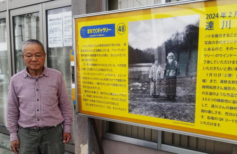 その写真の前で思わず、足が止まった。豊かな白髭をたくわえた長老と寄りそう老婦人…アイヌの衣装を身にまとった二人は川のたもとに立ち、身じろぎもしないで真っすぐに前を見つめている。「あたりの自然と一体化した誇りが感じられる」と案内をしてくれた造形作家の菅沼緑さん(78)。その静寂がこっちにもすう〜っと入り込んできた。 東和町の中心街、土沢商店街のあちこちにさりげなく、写真が飾られていた。緑(ろく)さんが10年以上前から手がけてきた「まちてくギャラリー」の48回目。今回は写真家の故達川清さんの作品26点が並べられた。「すごい。息を飲んだ。写真家の目がまるで露出計みたい」―緑さんはこの写真との偶然の出会いの衝撃をこう語った。ともに同窓(日大芸術学部の写真学科と彫刻学科)で、同じ東和町の移住者同士だったが、なぜか未知のままだった。スマホのカメラ電話で連絡を取り合い、今年2月3日に展示が始まった。達川さんの訃報が飛び込んだのはその直前の1月23日。自分の作品展を見ずに旅立ってしまった。 緑さんは2000年に移住し、いまは田瀬湖畔の旧保育所にアトリエを構えて、創作活動を続けている。目の前には廃校になった旧田瀬小学校の校舎がある。「モンパルナスを再びという妄想がふくらんできて…」―。大正の終わりから先の大戦の敗戦前後にかけて、東京・池袋一帯に長屋風のアトリエ村(住宅付き貸アトリエ)が点在していた。数多くの芸術家が参集したパリのモンパルナスをもじって「池袋モンパルナス」と呼ばれるようになった。彫刻家の父を持つ緑さんはここで生まれた。「隣はペンキ職人。朝が早いのに寝坊助。だから、母がその男の足にロープをまいて、朝になったらそれを引っ張って起こすわけ。俺をおんぶしたオヤジが電車の網棚にこの俺様を忘れてきて、大騒ぎになったことも」… 緑さんは今年2月29日付で「田瀬小学校―いきかえれ新聞」を創刊。「田瀬小学校が復活することの実現に向けて、 愉しみながら話しあう『ワイガヤ会議』をまず、呼びか けたいと思います」と書いた。全戸配布した結果、第1回会議(3月31日開催)には予想以上の32に人が集まり、「ワイワイガヤガヤ」に花が咲いた。第2回は5月12日に予定されており、「東和“モンパルナス”」という夢の実現へ向け、第一歩を踏み出した。新聞はすでに、4号を重ねた。 「日常の暮らしの中にそっと、アートを紛れ込ませる。忘れていた時にふと、気づく時があり、それがアートだ」と緑さんは口癖のように言う。まったくそうだと思う。今回の「達川清展」だって、見知らぬ者同士の合作の産物であり、私自身がいまその作品群に魅せられている。ひときわ、目を引くのがアイヌのポートレート。達川さんはスーパーカブに写真機材を積み込み、津軽海峡を何度も渡ったという。なぜ、達川さんがこれほどまでに“アイヌ群像”にこだわり続けたのか。「想像力を働かせよ」―達川さんの声があの世から聴こえてくるような気がする。 「池袋モンパルナスに夜が来た/学生、無頼漢、芸術家が/街にでてくる…」(「池袋風景」)ー。そういえば、池袋をモンパルナスに見立てたその名付け親はここを拠点にした北海道・小樽出身の詩人、小熊秀雄(故人)だったことを思い出した。この不世出の詩人には「飛ぶ橇(そり)―アイヌ民族の為めに」と題した長編叙事詩がある。展示は4月30日まで。 (写真は「静かなる凝視」を感じさせるエカシ(長老)とフチ(おばあさん)、そして緑さん=花巻市東和町の土沢商店街で) 《追記》〜住民投票条例案を議会へ提出(狛江市) 東京都狛江市の松原俊雄市長は26日、新図書館整備計画の賛否を問う住民投票条例案を、反対意見を付けて臨時市議会に提出した。5月15日に採決される。住民投票は、市民団体「こまえ図書館住民投票の会」が直接請求した。条例案は、1977年開館の市民センター内にある市中央図書館を「分割・移転」するか、「現在地で拡充」するかを市民が投票で選ぶという内容で、市と議会には結果の尊重を求めている。 これに松原市長は「『現在地で拡充』は多額の財政負担が生じることなどから実現が難しい。改めて問うのは現実的ではなく、住民投票に意義を見いだし難い」と反対意見を付けた。市は、現在地から約300メートル南東の市有地に新図書館を建設し、改修する市民センター内に子ども向け図書コーナーを残す方針。図書館機能の分割を批判する市民からは一体での整備を求める意見が出ている(28日付「東京新聞」電子版、3月15日付当ブログ参照)