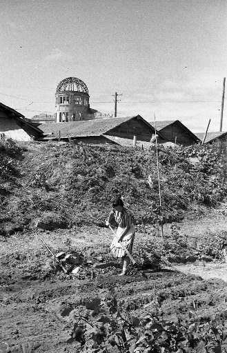 原爆ドームと畑を耕す女性