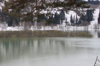 白川湖の新緑と朝霧