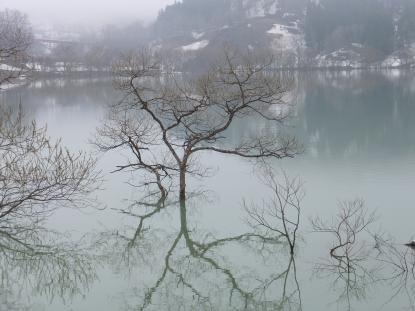 白川湖の湖面に浮かぶ柳の新緑