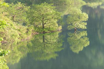 今年の白川湖はいつもとチョッと違います。水没林がまだ見れますょ。例年この時期水位が下がり始めますが、今のところ満水状態。今日の夕方は風もなく、水鏡状態です。