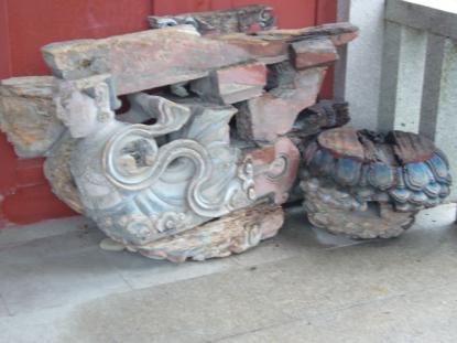 宋の時代の鋳造された鉄製の香炉と木彫りの見事な麒麟だ。