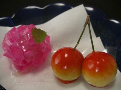 さて、こちらの写真は、うろこやさんの「さくらんぼ」と「あじさい」を形取った和菓子です。さくらんぼはのヘタは、本物を使用しており、まるで2Lサイズのさくらんぼを頬張るかのような感覚を覚えます。お味は、中身の餡は甘すぎず、すっと口の中で広がっていきます。