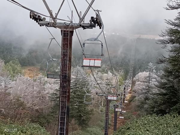 一昨日、天元台高原第三リフト1700m付近から上で初霧氷となりました・・降り場1820m乗降台は霜で真っ白に・・木々は真っ白になり、花が咲いているよう見えます。朝の試運転時点では気温−1°でした・・・とうとう来ました冬将軍という感じです、あさいちばんは気温マイナスで台上の木が凍結するため、かなり滑ります・・滑り防止にゴムマット敷いて対策します・・あまり朝早くに来ると登山道も滑りますから注意が必要です、1時間もすると北望台はプラスに転じてきますがさらに上に行くと1,2度気温低いので木道は注意しないとです・・リフトは今日23日入れて4日間26日(日)で終了です・・この後は冬装備の登山装備が必要となる・・リフトは27日からウインターシーズンに切り替え作業が入り11月22日からオープン予定・・また冬が来たと思うこの頃・・