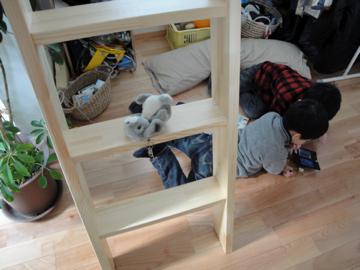 これは、玄関の収納棚の一番下に潜り込んでいる次男です。