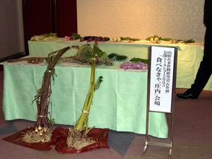 参加者は会場(東京第一ホテル鶴岡2F鶴の間)がほぼ満杯の250名以上、集った参加者の熱気に包まれました。会場の入り口と会場ステージの脇には山形県内各地(村山、置賜、最上、庄内地方)の在来野菜の展示を行い、参加者は目で見て耳で聞き舌で味わいながら在来野菜を堪能しました。