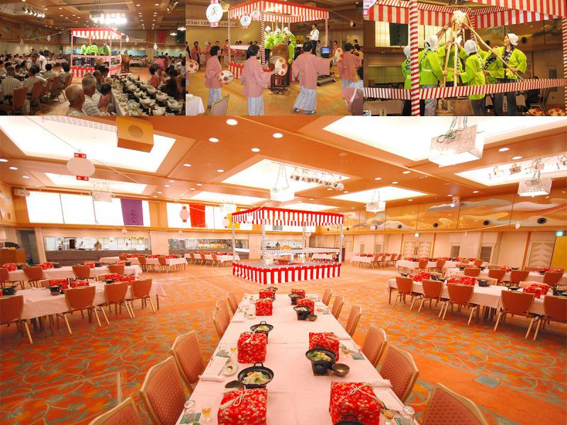 開放感溢れるコンベンションホールにて「花笠踊り」や「花笠餅つき」「オープンキッチンからの出来立て料理」などの数々の演出。
