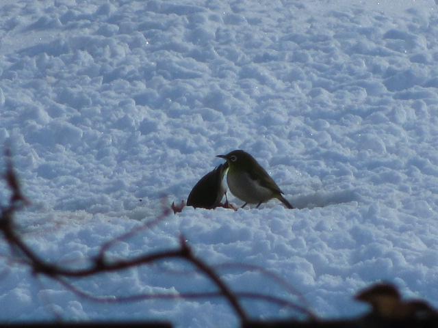 チョコンとするメジロ・・・リンゴはたくさんあるのにムクときたら・・・