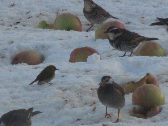 エサ場の真ん中で、他の鳥に混じってみたようです。大きさの違いが解りますね。
