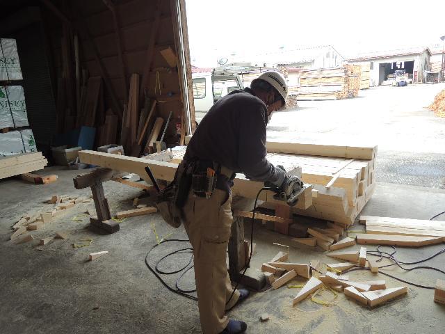 25日〜の軸組み建方に向けて、15日(月)〜大工さんが木材の事前加工をおこなっております。いつものように、材木やさんの敷地内で加工をおこなっております。