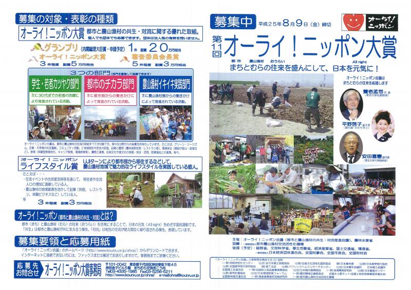 都市と農山漁村の共生・対流推進会議と農林水産省では、「都市側から送り出す活動」、「都市と農山漁村を結びつける活動」、「農山漁村の魅力を生かした受入側の活動」を実践している方々(オーライ!ニッポン大賞)や、Iターン等により農山漁村において個性的で魅力的なライフスタイルを実現している方々(オーライ!ニッポン ライフスタイル賞)を表彰するとともに、優れた取組事例を幅広く普及することで、各地における共生・対流に向けた様々な活動を一層促進することを目的に「オーライ!ニッポン大賞」を実施します。