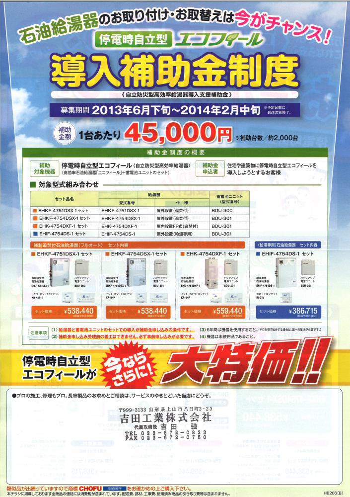 だいぶブログの更新が遅れてしまいました。。が、みなさまこれからもよろしくお願いします〜(*´`)笑 今回は、石油給湯器のお知らせです。CMでもお伝えしておりました、長府の停電自立型エコフィール! こちらお買い上げの方に今なら補助金が、なななんと \ ¥45,000円 / この補助金額は大きいですよね ( ´ ▽ ` )! 停電時自立型エコフィール。 停電時でも 4人家族 が 1日1回 ( 3日間 ) 給湯・シャワーが使えるようになるんです!! ※詳しくは長府製作所HP参照をご覧下さい ヽ(*´∀`)ノ 災害への備えとしてご検討してみてはいかがでしょうか?^^* 補助金制度期間は・・・ 2013年6月25日〜2014年2月17日(予定) です。 こちらの企画、みなさまよりご好評を頂いているようで、メーカーさんの話によると、、エコフィールの台数も残りわずかになってきているとのことです。 当店でも展示しておりますので、お気軽にご来店ください♪ 停電自立型エコフィール?見たことないなぁ〜という方のためにのちほど ツイッターに 停電自立型エコフィール アップしておきますね o(^▽^)o この機会をお見逃しなく!