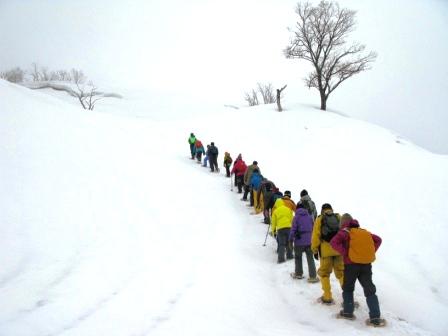 地元マタギの案内で残雪の森の中をカンジキをつけてフィールドワークします。