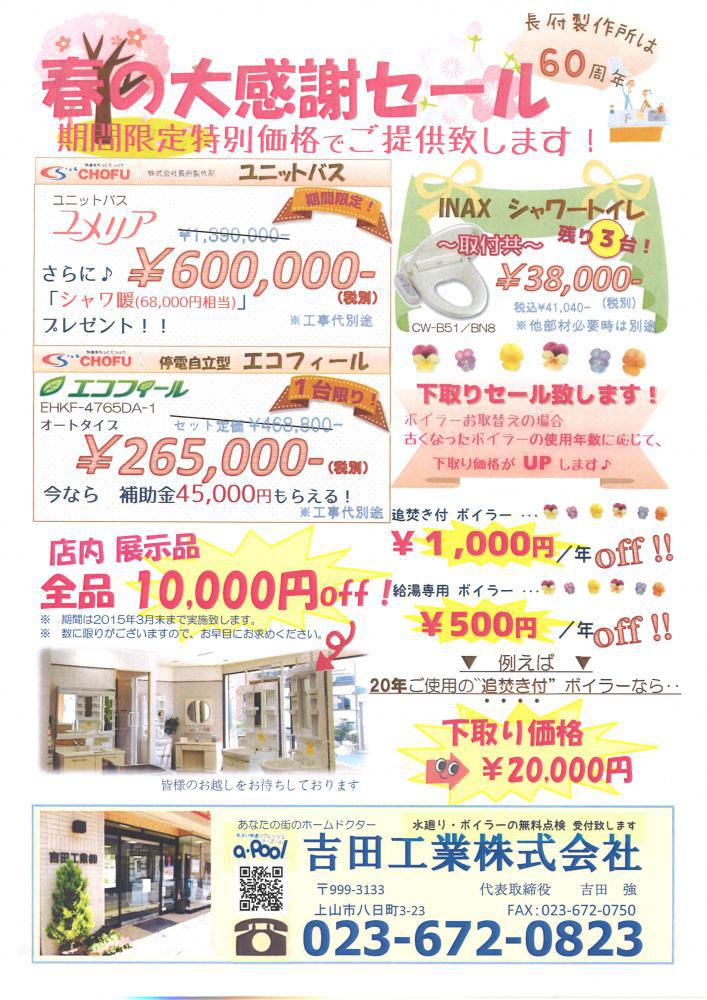 日頃より当店をご利用いただきありがとうございます! 2月も半ばを過ぎ、、仙台にショッピングへ行くと、マネキンさんがすでに春物を着ていたり・・♪そういうのを見ていると、 春、春、春ーー!!!春まだかなーーーーー!!!!と大声で叫びたくなります (*´∀`*) もう雪はいらないですよね!春がいいですよね〜♪ ということで (・∀・)ツイッターにも以前につぶやきましたが、春のちらしが完成しました!! ででーんっ!!その名も「春の大感謝セール」です(`・ω・´)♪ 前回の、冬セールで好評だった品物が引続きお買い得だったり なんと!!!3月末までは、店内展示品が 全品¥10,000円 OFF!! なので広告には店内の写真を載せてみました♪ なお、他のセール品、10,000円未満の商品に関しましては割引対象外 とさせていただきますので予めご了承ください。 展示品には数に限りがありますので、お早目にご検討ください ヽ(´▽`)/ 他にもお買得商品もりだくさんの春セールをお見逃しなく!!(^O^)