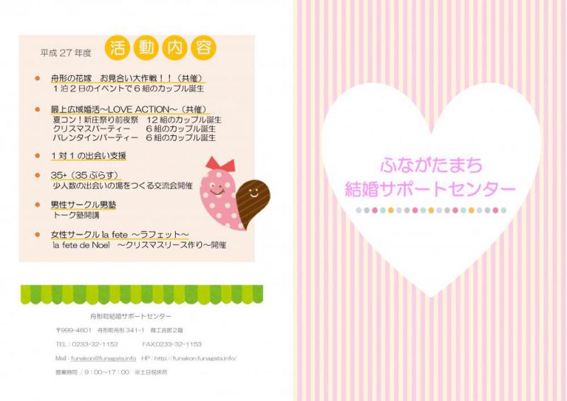 こんばんは(´・ω・`) 本日2度目のブログです笑  最近はHPでもFacebookでもイベントの告知しかしていない気がして… 本年度に舟形町結婚サポートセンターがどのような事業を行ってきたかを皆さんにお伝えしなければ!!と思い立ったが吉日!!ということでご報告いたします笑  ★☆平成27年度 舟形町結婚サポートセンター 活動内容☆★ ・舟形の花嫁 お見合い大作戦!!(共催) 芋煮会などを通した1泊2日のイベントで6組のカップルが誕生!! ・最上広域婚活〜Love Action〜(共催) −夏コン!新庄祭り前夜祭…12組のカップルが誕生 −クリスマスパーティー …6組のカップルが誕生 −バレンタインパーティー…6組のカップルが誕生 ・真っ赤な恋活バスツアー(尾花沢と共催) 3月に行われるバスツアー! ・1対1の出会い支援 ・35+(ぷらす) 少人数での大人の出会いの場を作る交流会 ・男性サークル男塾 女性スタッフと模擬イベントを通して会話を学ぶ実演型のトーク塾を開講 ・女性サークル la fete〜ラフェット〜 女性が自分磨きで輝ける場の提供としてクリスマスリース作りを開催  主な活動は以上の通りです(∩´∀`)∩ 男塾やラフェットは今後定期的にデート塾やクッキングスクール等を開催していきたいと思います! こんなイベントがあれば…こんなサービスがあれば…という皆様のご意見お待ちしています!