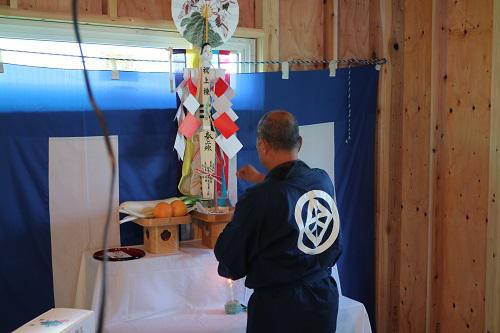 無事に棟木も上がり、本日めでたく、K様邸の上棟式を迎える事ができました。式も滞りなく進み、最後に参加者全員で乾杯をいたしました。季節は秋になり朝晩と寒くなってきましたが、体調管理には十分気をつけて工事を進めてまいります。