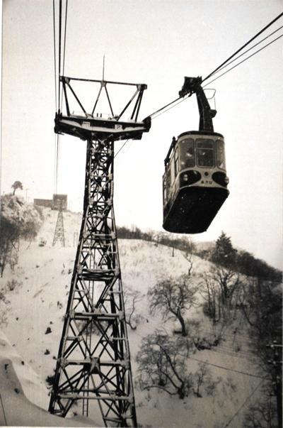 天元台は、もともとあった地名ではなく、この地が開発されるにあたり当時の米沢市長により命名されたとあります。「天元」とは囲碁用語で碁盤の中心のことで、転じて『世界の中心』という意味(中国の自然観のひとつで、万物成育の源)とあり高原駅のところに記載があります、麓の湯元からロープウェー初代1963年(昭和38年)営業開始初年の冬の写真です、シンボルの赤松の木がポツンと見えますネ、貴重な写真です。初代は昭和61年10月で終了、2代目昭和61年11月から平成29年5月7日で終了、現在は3代目平成29年6月3日から営業してます。