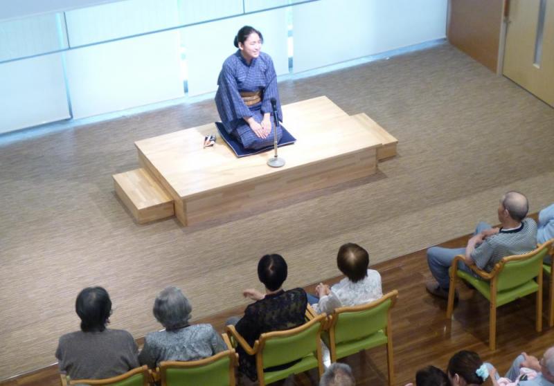 8月8日、「和合寄席」が開催されました。話し手は「慶應義塾大学落語研究会」の皆さんです。地域の方や近隣の福祉施設の方々が来荘され、賑やかで楽しい時間を入居者さんと過ごされました。 そこで、今月は『落語』にピックアップです。日本の伝統芸能である落語とは、一言で言うと落ちのある話のことだそうです。落語は、歌舞伎などの伝統芸能と違い、上半身の身振り手振りで噺を進め、一人で何役も演じ分けます。それだけでも凄いことですが、舞台装置はなく、扇子と手ぬぐいなどの小道具であらゆる物を表現することに驚きです!江戸時代に庶民(町民)から発生したと言われる落語ですから、最初はどこにでもいる話し上手で情報通な人が、失敗話や人情話を面白おかしくご近所さんに話したのが始まりかもしれません。想像してみると、文化の成り立ちの面白さを感じますね。