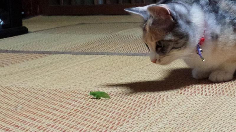 真剣な眼差しで、バッタを観察するにこちゃんです。