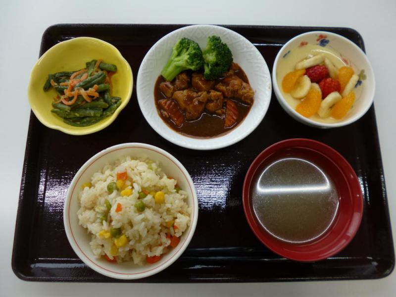 本日12月25日は、クリスマスですね。今日のお昼はクリスマスメニューです!ピラフ、鶏肉のデミグラスシチュー、いんげんのソテー、スープ、デザートがついたクリスマス洋食メニューとなりました。主食のピラフは、ミックスベジタブルの彩りがとてもきれいです。主菜は鶏のデミグラスシチューです。柔らかく煮込んだ鶏肉がとてもおいしそうですね。また、添え物のブロッコリーの緑が鮮やかです。それに副菜のいんげんのソテー、スープ、デザートがついた豪華な内容となっています。そしてデザートは、なんと手作りプリンアラモードです!プリンに生クリームとイチゴなど果物をたくさんのせた見た目もかわいらしいデザートになりました。おいしい昼食に、皆さん楽しんでいましたよ。